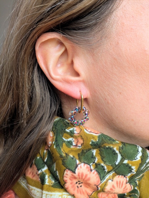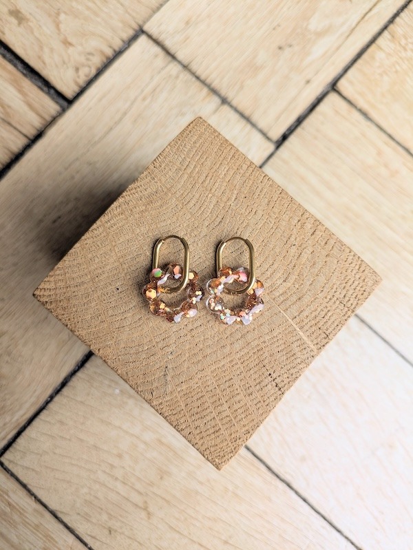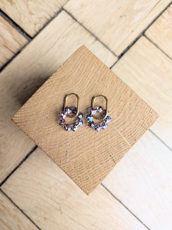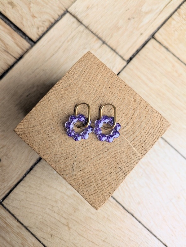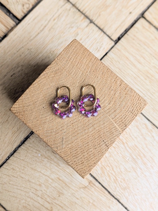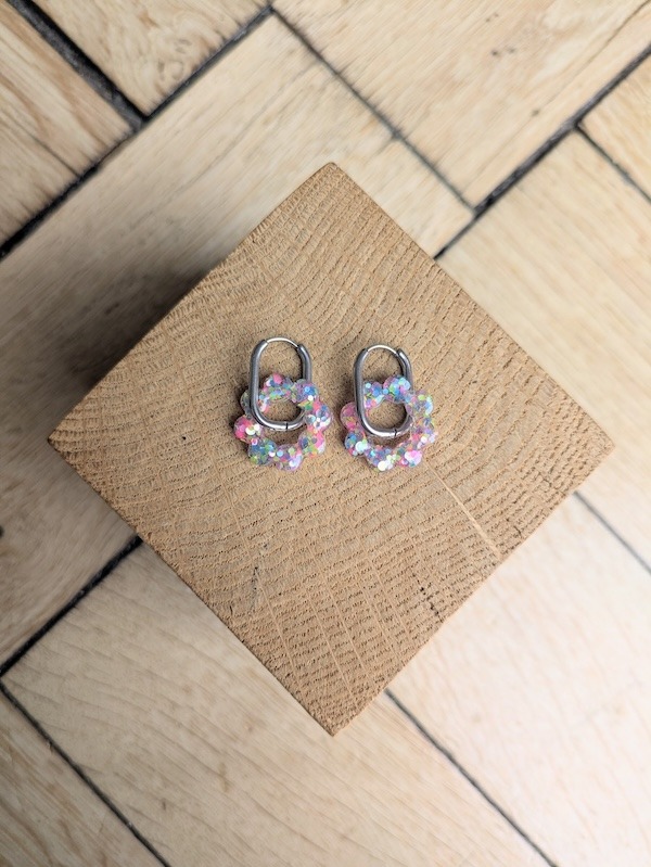 Créoles ovales avec pendentif en forme de fleur ronde en résine époxy contenant des paillettes entièrement réalisée à la main, colorées et festives, très légères et faciles à porter