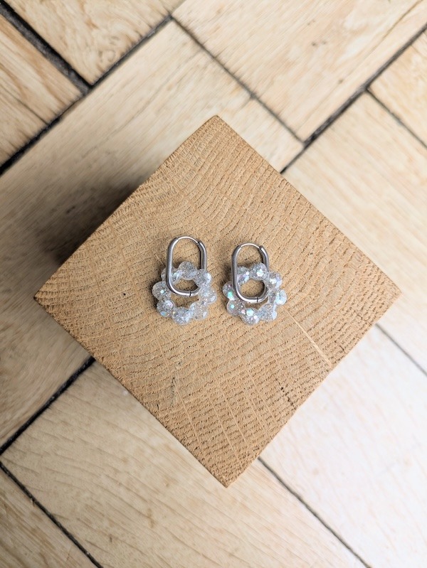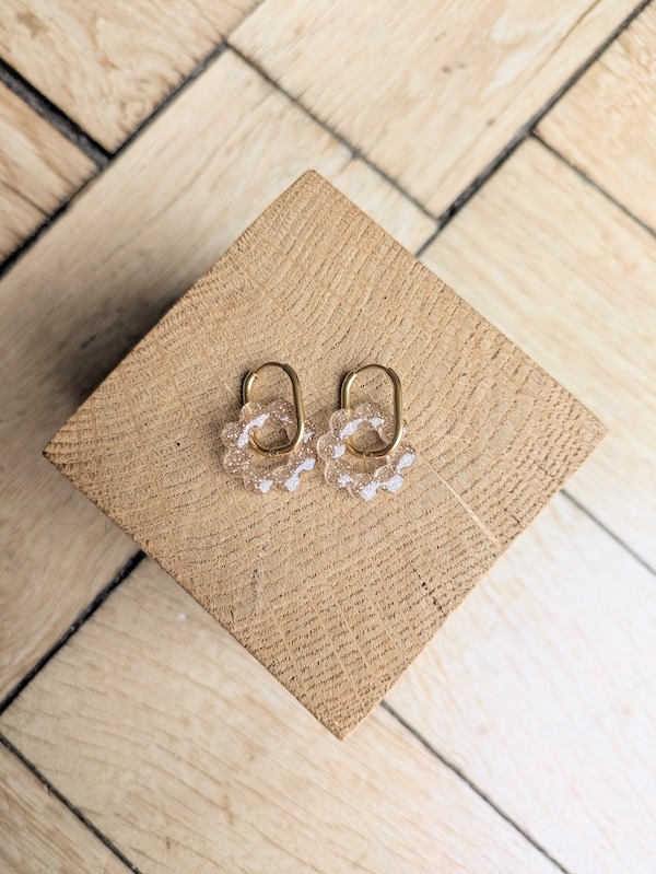 Pendentif fleur réalisé à la main de façon unique et artisanale dans le Nord de la France. Résine réalisée à base de paillettes, chaque pendentif est unique et différent, comportant des nuances (taille, couleur, forme…). Clips d’oreilles disponibles sur demande en doré ou argenté pour oreilles non percées.