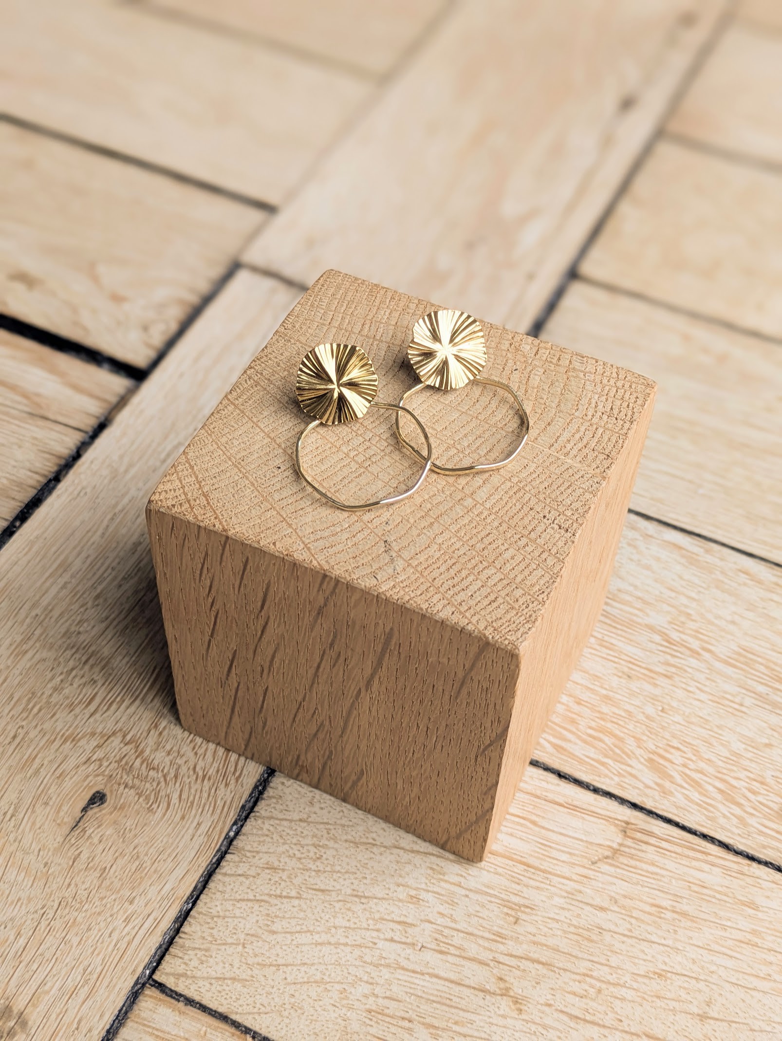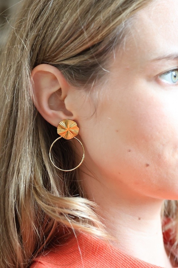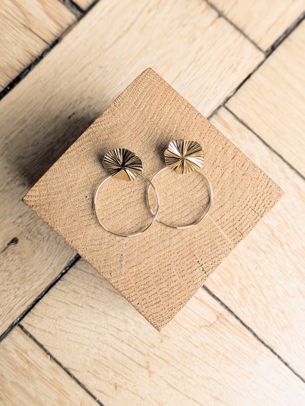 Clous d’oreilles rond plissé et pendentifs anneaux, raffinées, tendances et légères.