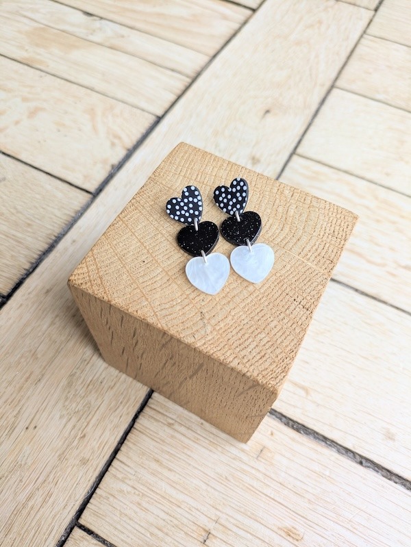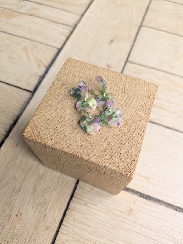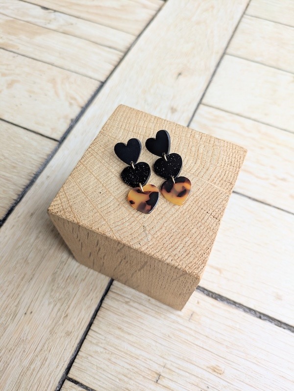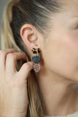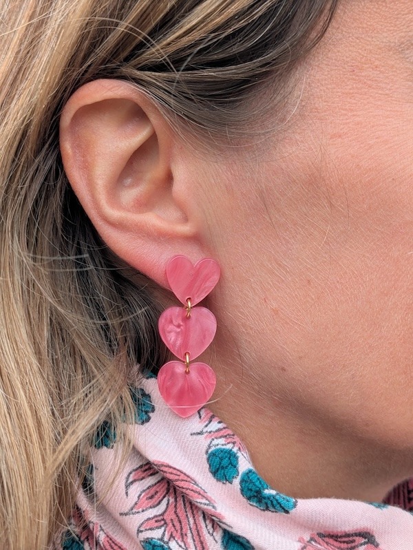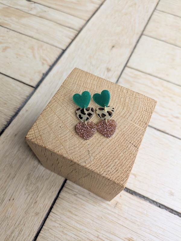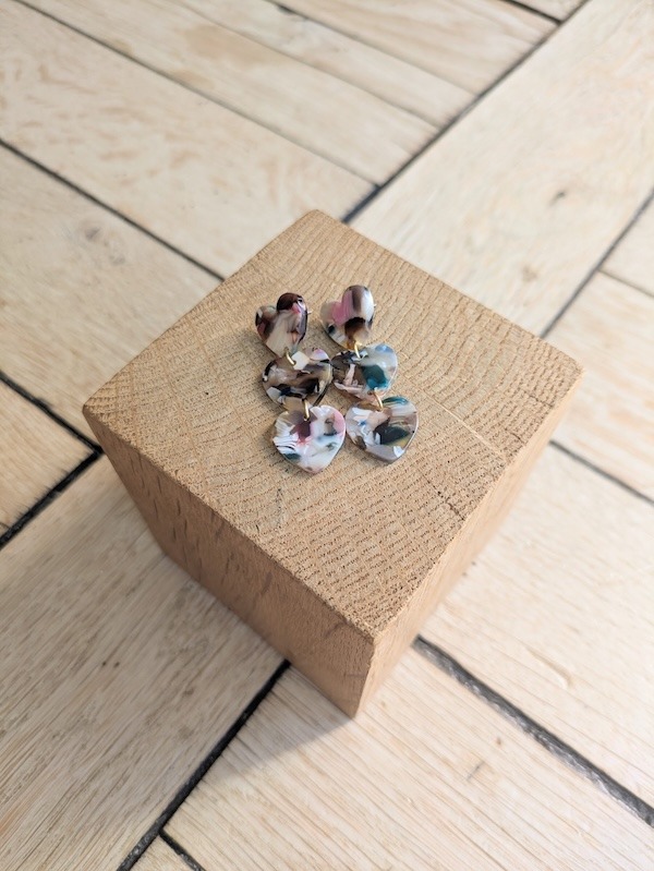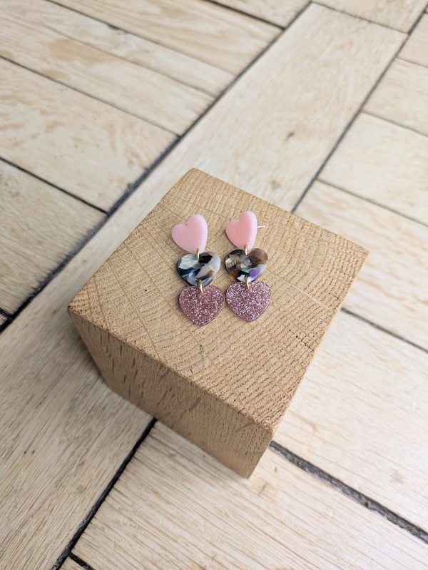 Clous d’oreilles coeur en acier inoxydable et pendentifs en forme de coeur en résine colorée .