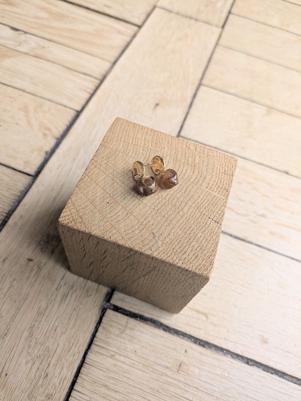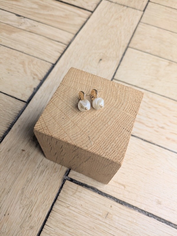 Clous d’oreilles en laiton doré à l’or fin 18K et perle en acrylique.