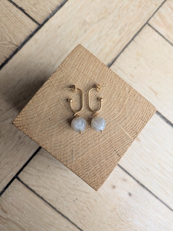 Créoles ouvertes rectangulaires avec perle irrégulière marbrée, tendances et légères.