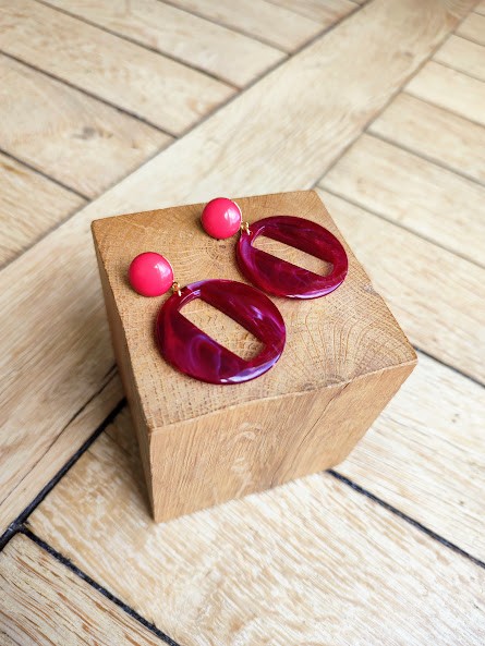 Boucles d’oreilles légères, colorées et très tendance cette saison, clous d’oreilles en laiton doré à l’or fin et cabochon en résine coloré, pendentif cercle évidé en résine colorée. Adaptation en clip possible sur demande
