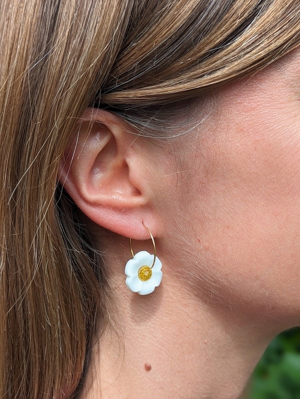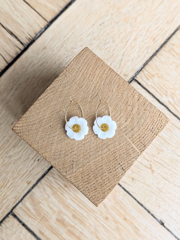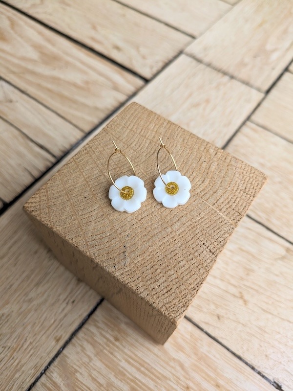 Créoles rondes avec pendentif en forme de fleurs en résine époxy entièrement réalisée à la main, poétiques et tendances, ultra légères et faciles à porter.