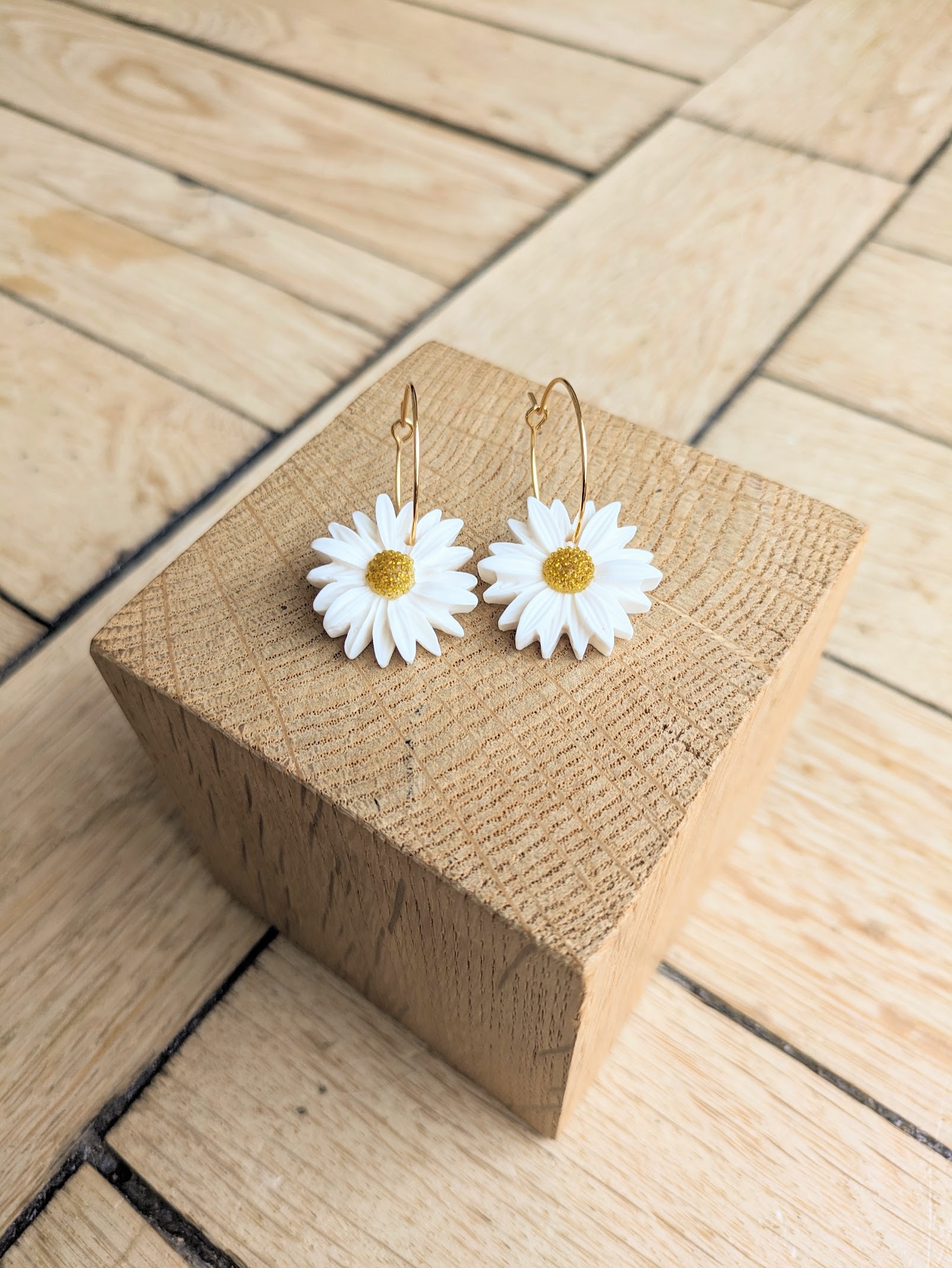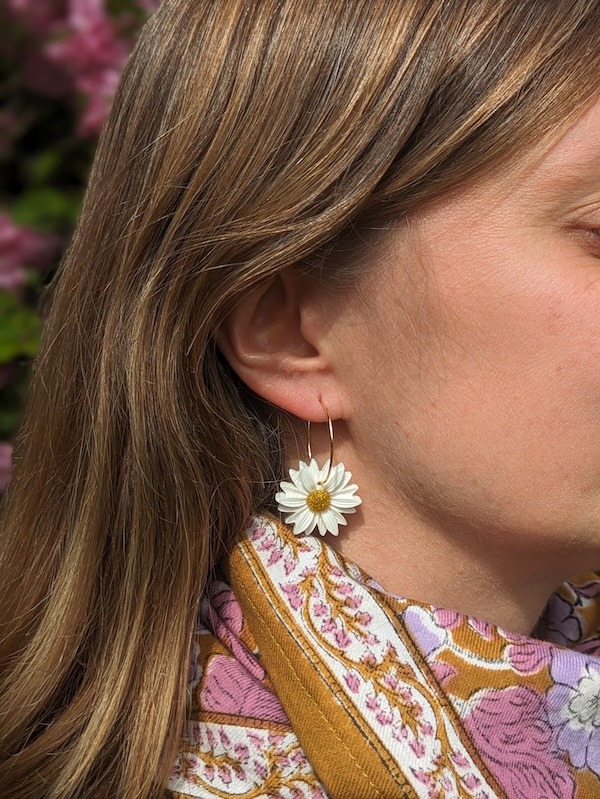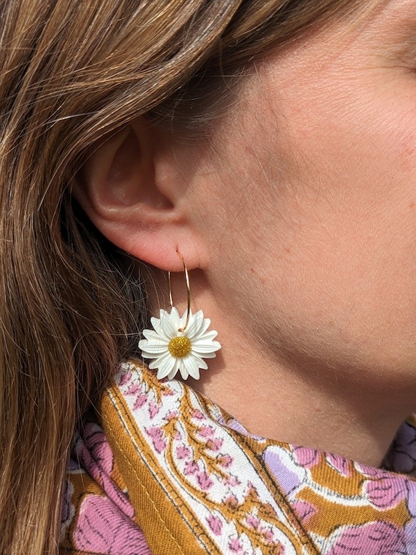 Créoles rondes avec pendentif en forme de fleurs en résine époxy entièrement réalisée à la main, poétiques et tendances, ultra légères et faciles à porter.