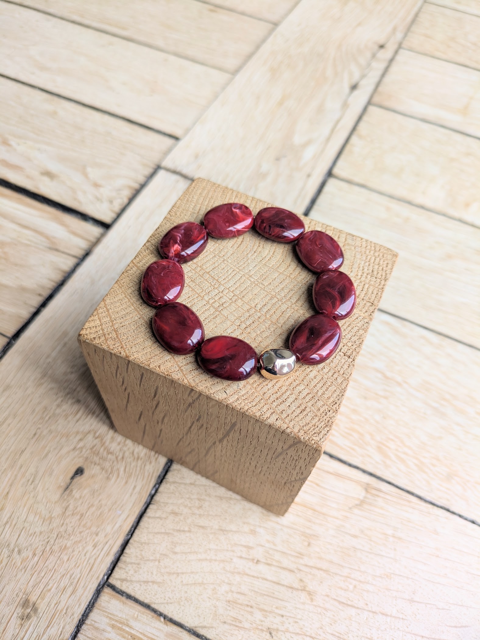 Bracelet élastiqué, taille unique environ 16cm de diamètre (me contacter pour une perle supplémentaire soit environ 17cm), perles acryliques et perle irrégulière en laiton doré à l’or fin