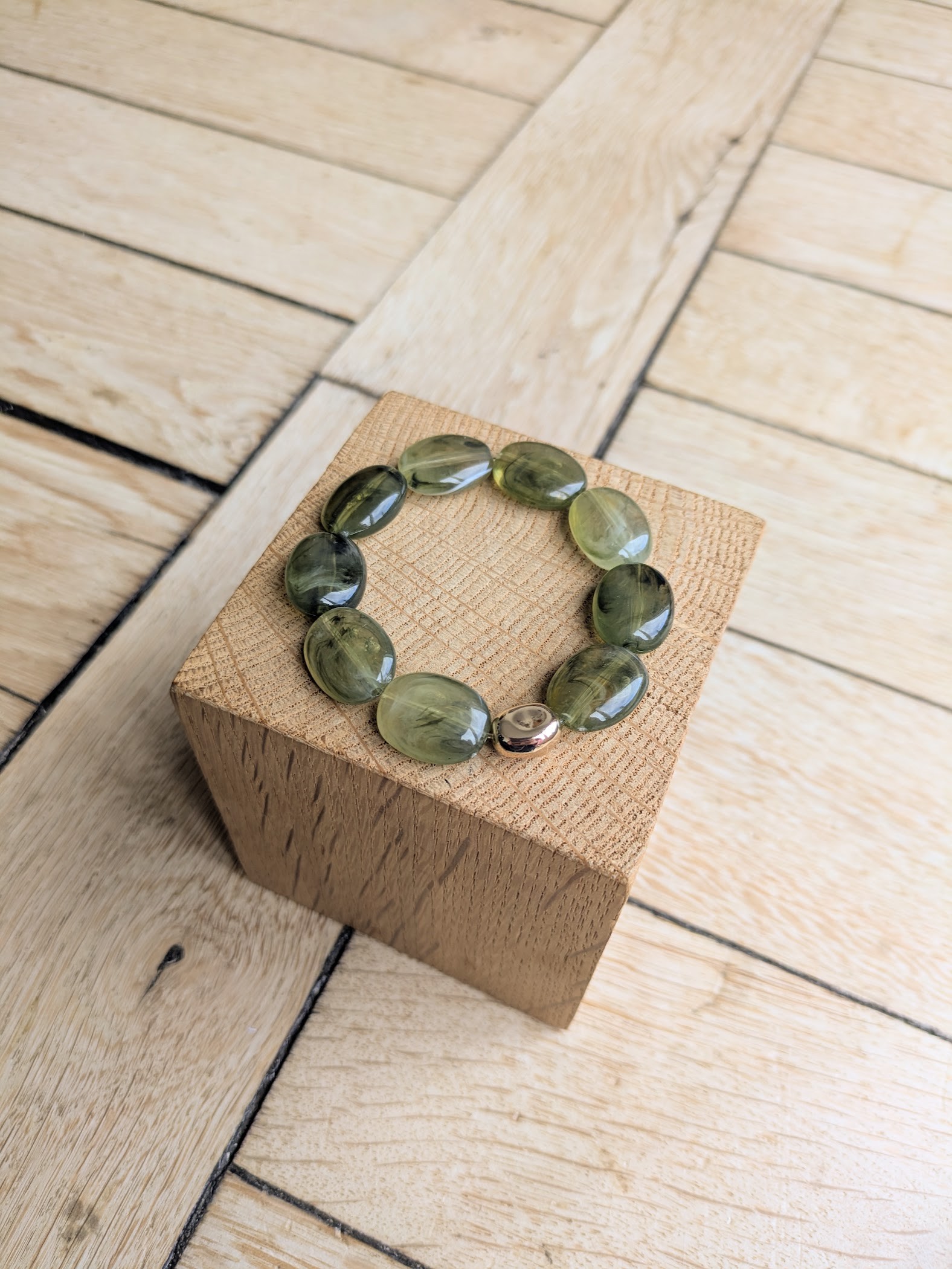 Bracelet élastiqué, taille unique environ 16cm de diamètre (me contacter pour une perle supplémentaire soit environ 17cm), perles acryliques et perle irrégulière en laiton doré à l’or fin