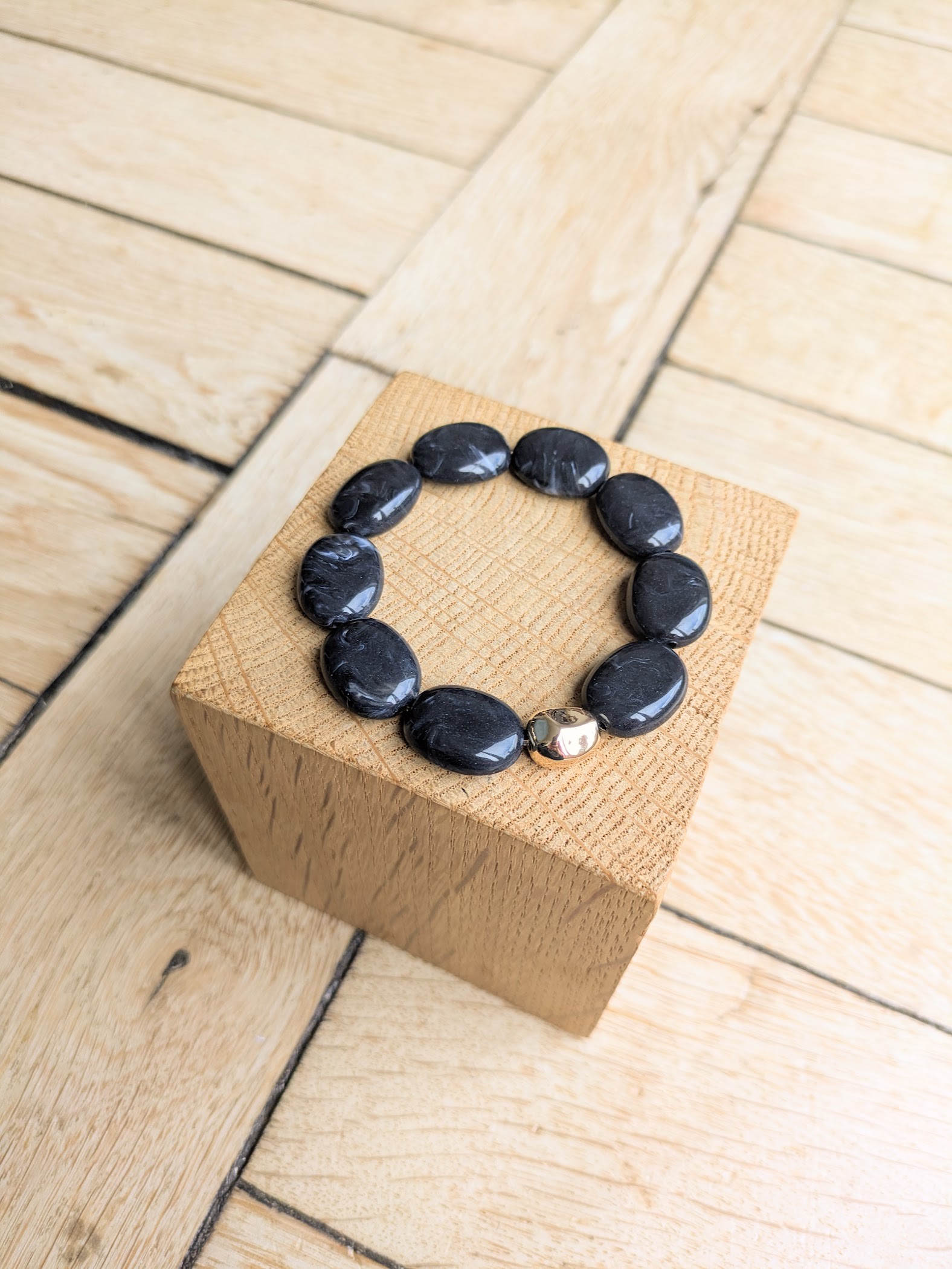 Bracelet élastiqué, taille unique environ 16cm de diamètre (me contacter pour une perle supplémentaire soit environ 17cm), perles acryliques et perle irrégulière en laiton doré à l’or fin