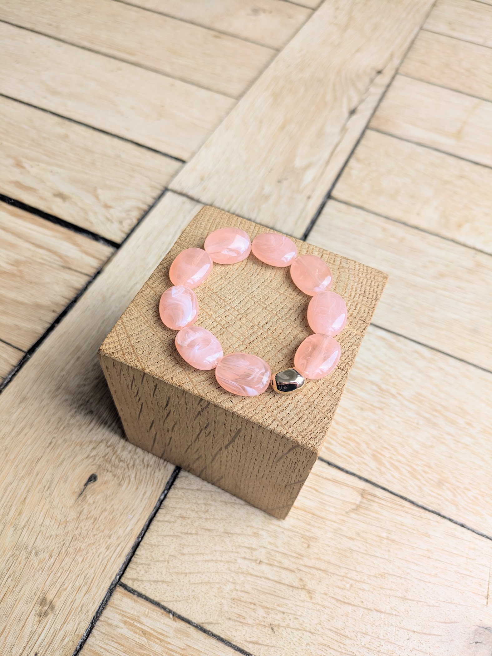 Bracelet élastiqué, taille unique environ 16cm de diamètre (me contacter pour une perle supplémentaire soit environ 17cm), perles acryliques et perle irrégulière en laiton doré à l’or fin