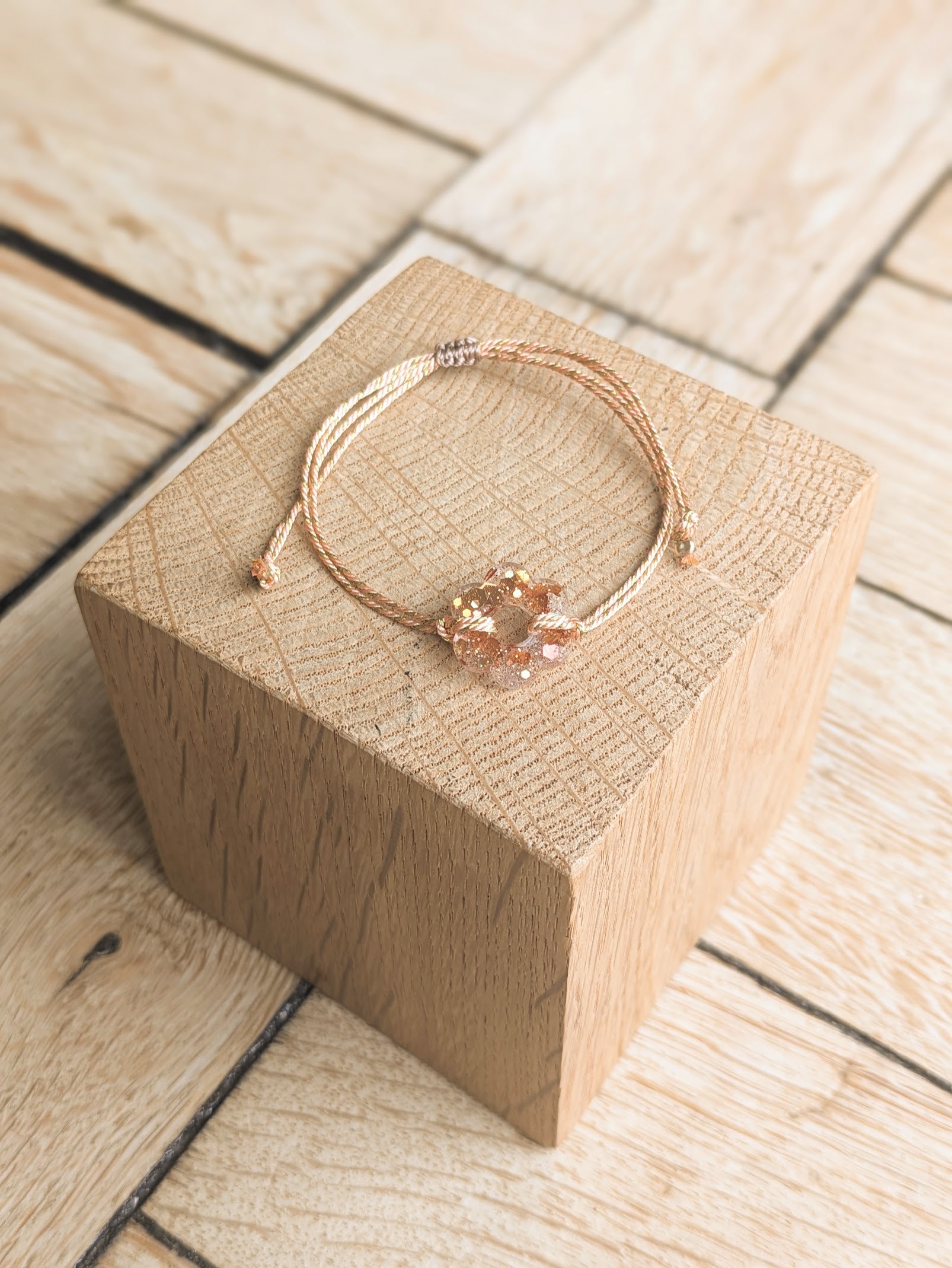 Fin bracelet en cordon coloré et pendentif fleur en résine époxy, très tendance cette saison, à porter en accumulation avec les bracelets CLYDE, JOY, ERINE, etc…