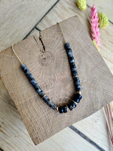 Collier très fin, intemporel et délicat, chaîne serpentine et plaqué or, perles rondelles en pierre naturelle et perle en plaqué or. Longueur max portée : 24cm de hauteur total. Plaqué or et pierres naturelles, rose : Agathe teintée, bleu roi : lapis lazuli, noir : black onyx (bcp d’autres coloris de pierre naturelle sont possibles sur demande). S’associe parfaitement aux boucles d’oreilles et bracelets Ellie.Tous les modèles All u Need is Love sont fabriqués à la main près de Lille